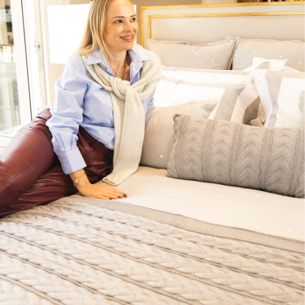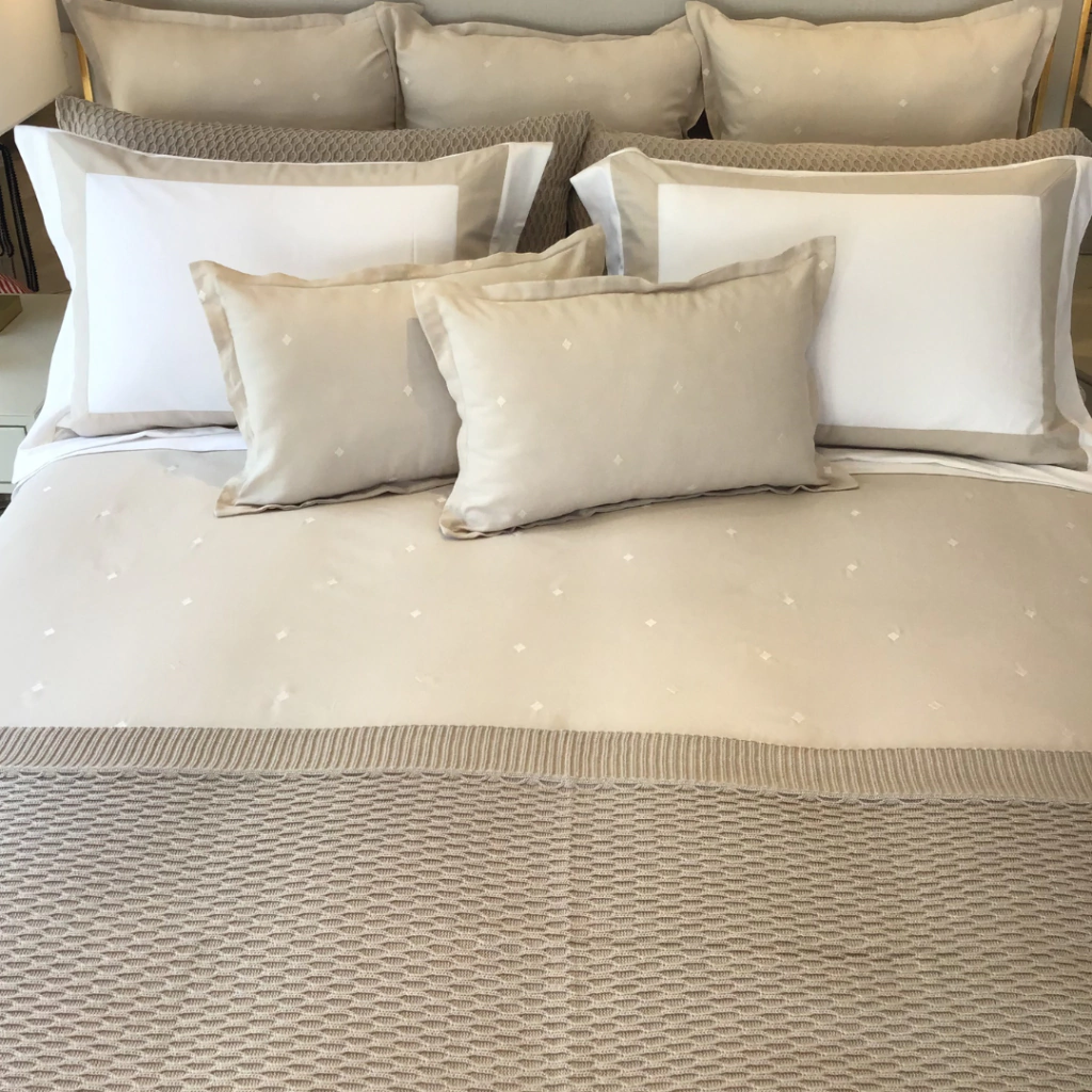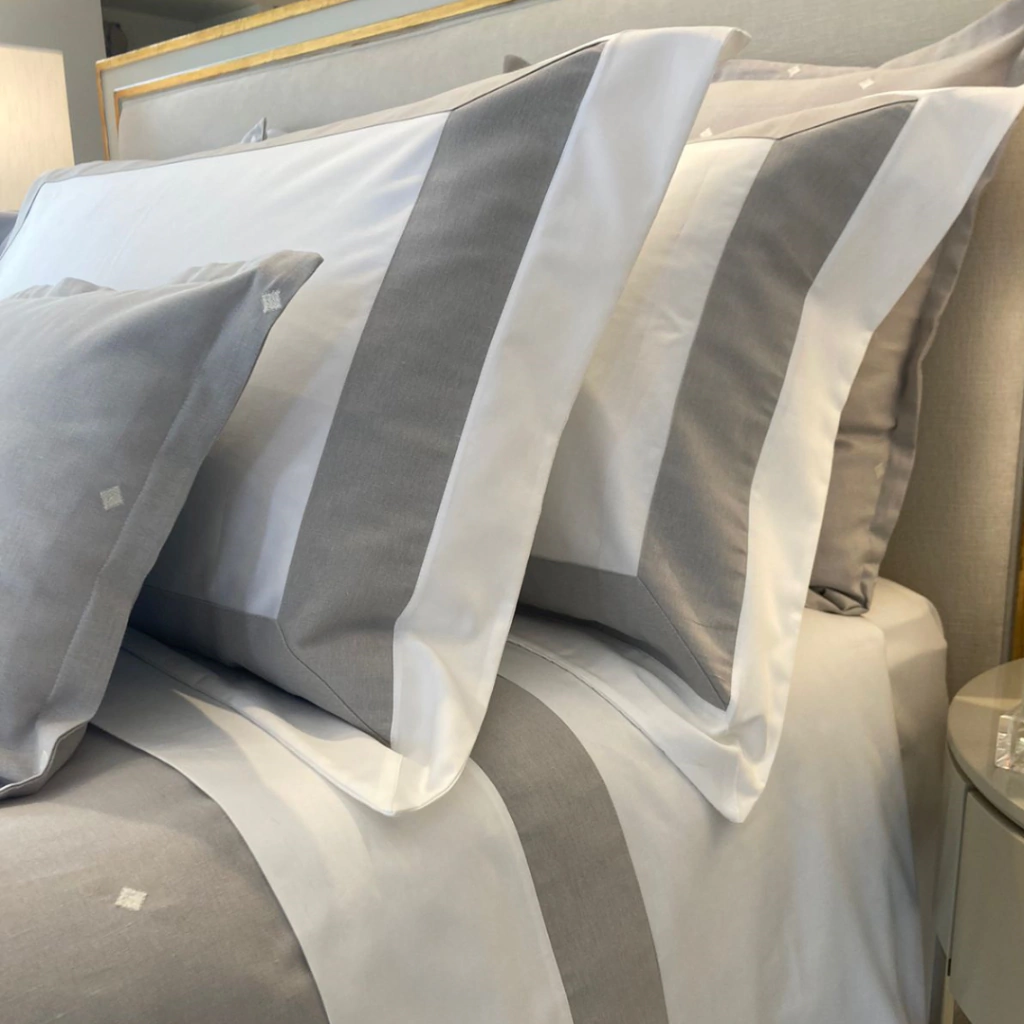 Numa mistura perfeita entre materiais naturais, o linho e o algodão se combinam com bordados requintados em toda a extensão do duvet, almofadas e euros; deixando as faixas em linho para os travesseiros em seus diferentes formatos.