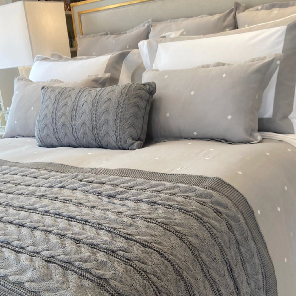 Numa mistura perfeita entre materiais naturais, o linho e o algodão se combinam com bordados requintados em toda a extensão do duvet, almofadas e euros; deixando as faixas em linho para os travesseiros em seus diferentes formatos.
