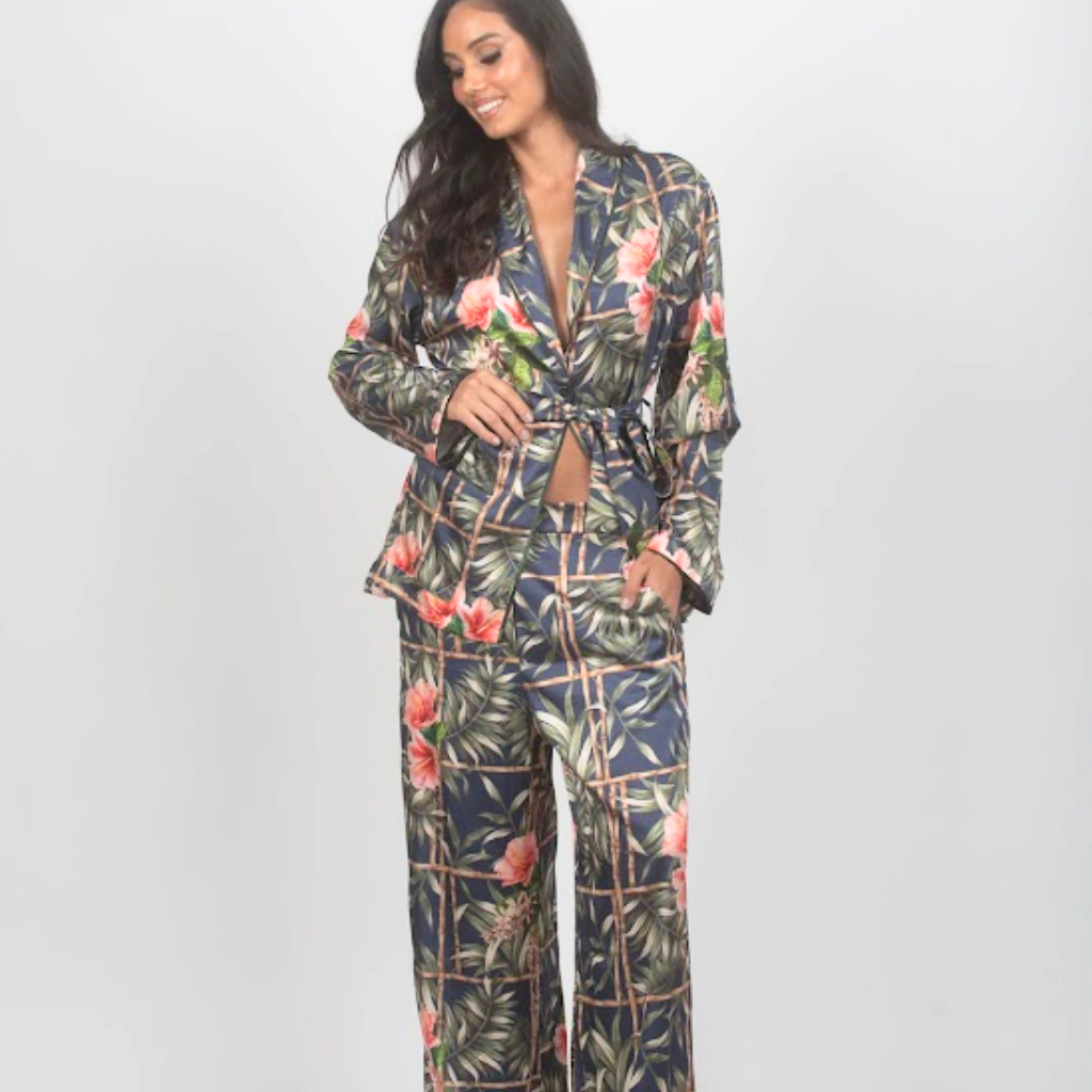 A estampa exclusiva, com folhagens tropicais e flores vibrantes, reflete elegância e frescor, tornando a peça perfeita tanto para momentos de descanso quanto para composições fashionistas.