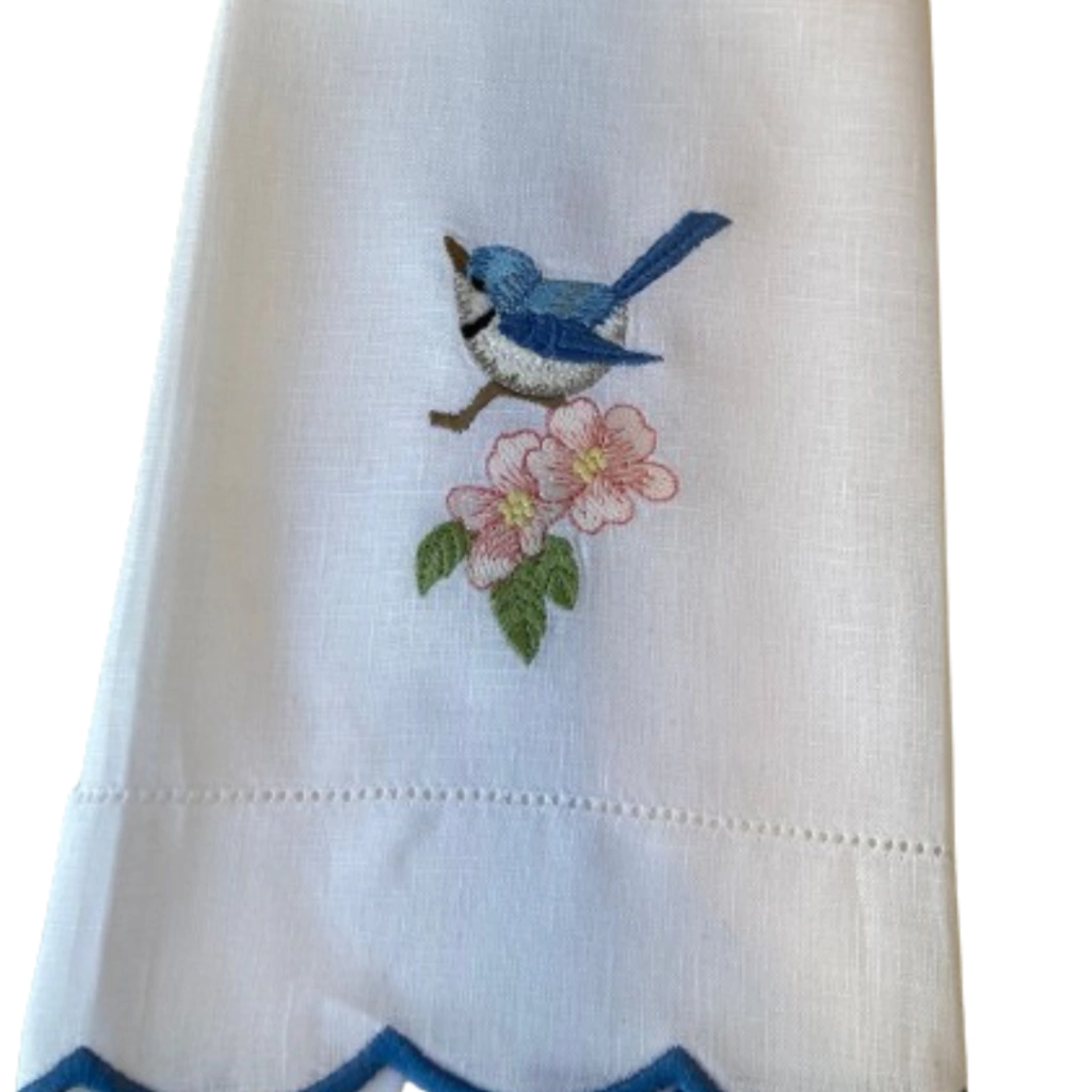 Feita em linho e algodão, essa toalha une qualidade e sofisticação. O bordado de pássaro delicado e o acabamento em ponto ajour trazem um charme especial, tornando-a perfeita para qualquer decoração.
